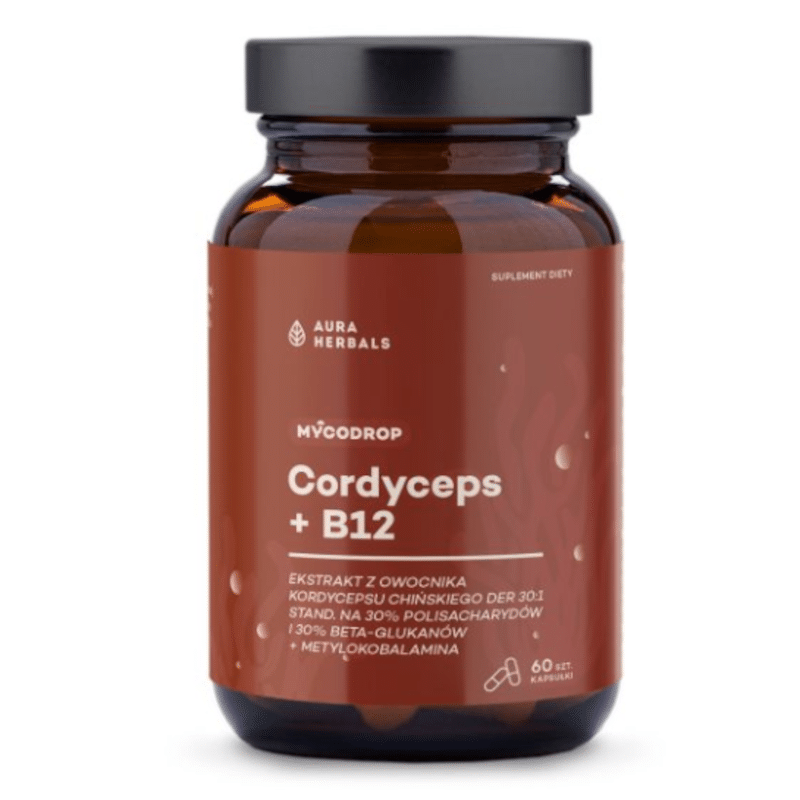 Suplement diety Aura Herbals Mycodrop Cordyceps + B12 to nowoczesna, starannie opracowana formuła oparta na standaryzowanym ekstrakcie z owocnika kordycepsu chińskiego oraz witaminie B12 w aktywnej formie metylokobalaminy. Produkt został stworzony z myślą o osobach, które szukają naturalnego sposobu na wsparcie energii, funkcji psychicznych oraz prawidłowego funkcjonowania układu nerwowego.