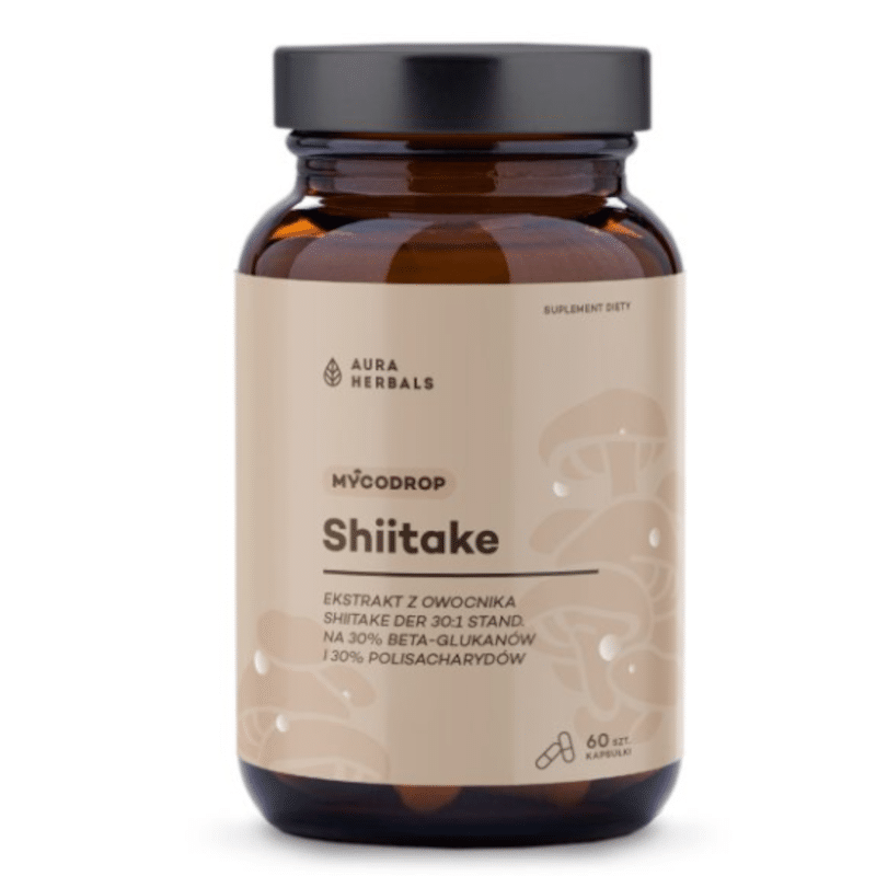 Suplement diety Mycodrop Shiitake 30:1, 30% beta-glukan, 60 kapsułek od Aura Herbals to wysokiej jakości produkt oparty na standaryzowanym ekstrakcie z owocnika grzyba Shiitake (Lentinula edodes). Dzięki wysokiej koncentracji składników aktywnych i czystej formule, Mycodrop Shiitake w tej postaci stanowi doskonałe wsparcie dla osób, które chcą zadbać o odporność, witalność oraz ogólne funkcjonowanie organizmu.