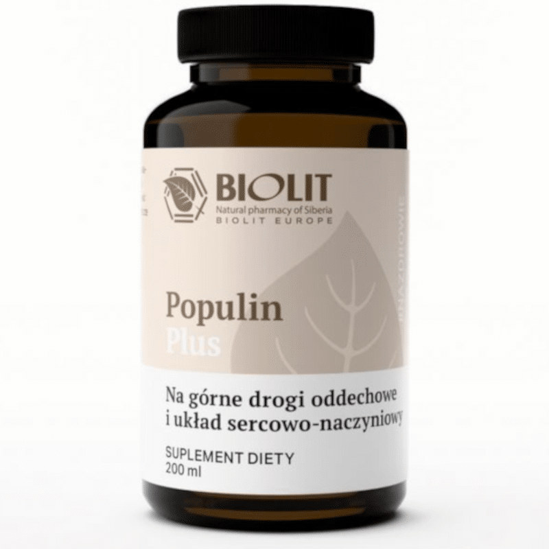 BIOLIT Populin to zaawansowany suplement diety opracowany z myślą o wsparciu zdrowia górnych dróg oddechowych oraz układu sercowo-naczyniowego. Jego unikalna formuła łączy naturalne ekstrakty z topoli czarnej (Populus nigra Gemma) i drewna modrzewia dahurskiego (Larix gmelinii), bogatego w taksyfolinę – silny przeciwutleniacz. Populin to produkt pochodzący z dziewiczych terenów gór Ałtaju w Syberii. Gwarantuje najwyższą jakość a także skuteczność w codziennej pielęgnacji zdrowia. BIOLIT Populin to idealny wybór dla osób, które chcą w naturalny sposób wspierać zdrowie swojego układu oddechowego jak i również sercowo-naczyniowego. Dzięki zawartości naturalnych ekstraktów o silnym działaniu, suplement ten pomaga w utrzymaniu dobrego samopoczucia i witalności na co dzień. Jego regularne stosowanie wspiera odporność organizmu, poprawia komfort oddychania oraz wspomaga zdrowie serca i naczyń krwionośnych.