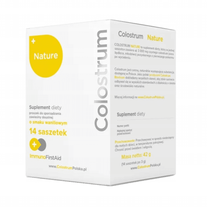 Colostrum Nature wyróżnia się czystością i standaryzacją, co oznacza, że każda porcja dostarcza gwarantowanej ilości biologicznie aktywnych substancji wspierających układ odpornościowy. Produkt dostępny jest w wygodnej formie 14 saszetek w kartonowym opakowaniu, co zapewnia łatwe i higieniczne dawkowanie.
