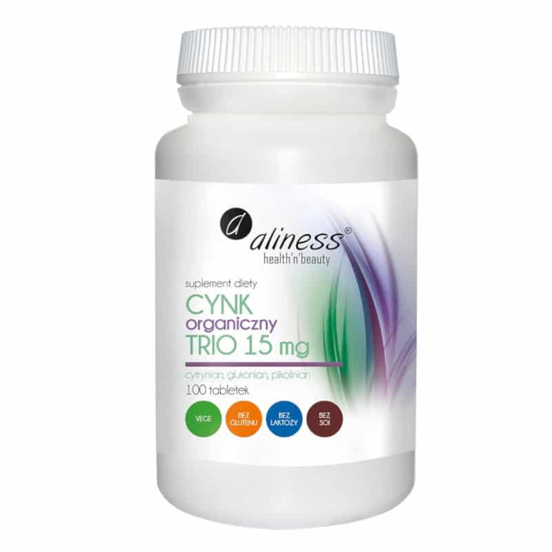 Cynk Organiczny TRIO to suplemencie diet, w którym znajduje się cytrynian cynku, glukonian cynku, a dodatkowo pikolinian cynku – formy organiczne cynku charakteryzujące się wysoką przyswajalnością. Zawartość każdej formy cynku to po 1/3 w przeliczeniu na jony cynku. Małe tabletki, łatwe do połknięcia dla dorosłych, jak i również dzieci. Minimum substancji technologicznych, produkt nie zawiera dodatków chemicznych (kontrowersyjnych). 15 mg jonów cynku.