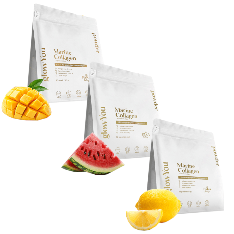 Suplement diety Kolagen morski glowYou 5 000 mg w trzech cudownych smakach mango, arbuz i cytryna to innowacyjna formuła stworzona z myślą o kompleksowym wsparciu skóry, włosów, paznokci oraz stawów. Dzięki wysokiej zawartości hydrolizowanego kolagenu rybiego Naticol® oraz dodatkom składników anti-aging, produkt ten stanowi doskonałe uzupełnienie codziennej pielęgnacji od wewnątrz.