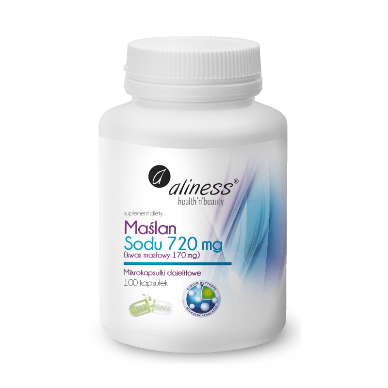 Maślan Sodu 720 mg, Kwas masłowy 170 mg to suplement diety, który ma zastosowanie w wielu schorzeniach układu pokarmowego. Produkt jest wsparciem leczenia podstawowego, ale także dla uzupełnienia diety, gdy pojawiają się różnego rodzaju zaburzenia, tj. biegunka, zaparcia, wzdęcia bez wyraźnie określonej przyczyny, niebędące objawem chorób.