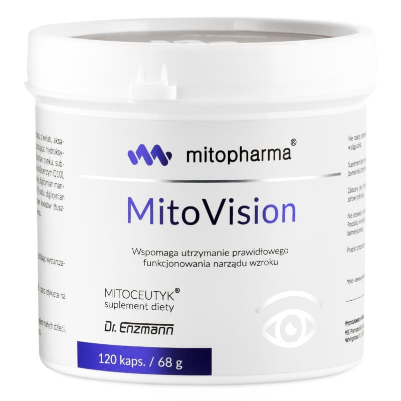 MitoVision to zaawansowany suplement diety opracowany z myślą o wsparciu wzroku oraz ochronie zdrowia oczu. Ponadto dzięki połączeniu luteiny, zeaksantyny, tauryny, koenzymu Q10 i kluczowych mikroelementów, produkt ten wspiera funkcjonowanie siatkówki, redukuje zmęczenie oczu ale również chroni przed szkodliwym wpływem wolnych rodników.