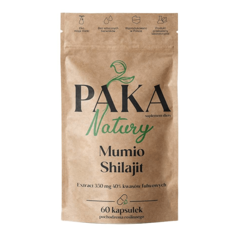 Mumio, znane także jako Shilajit, to naturalna, mineralno-organiczna substancja powstająca przez tysiące lat w szczelinach skalnych wysokogórskich rejonów Azji. Bogata w składniki mineralne, aminokwasy, kwasy humusowe i przede wszystkim kwasy fulwowe, Mumio uznawane jest za adaptogen – czyli substancję wspierającą organizm w przystosowywaniu się do stresu i niekorzystnych warunków zewnętrznych. W suplemencie diety Paka Natury zastosowano ekstrakt z Mumio standaryzowany na 40% kwasów fulwowych, co gwarantuje wysoką jakość i efektywność działania.