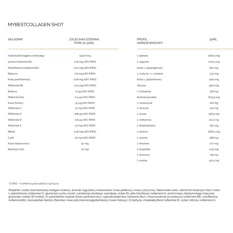Woda, hydrolizowany kolagen wołowy, aromat, regulatory kwasowości: kwas jabłkowy i kwas cytrynowy, hialuronian sodu, ubichinon (koenzym Q10), kwas L-askorbinowy (witamina C), glukonian cynku (cynk), substancja słodząca: sukraloza, octan DL-alfa-tokoferylu (witamina E). amid kwasu nikotynowego (niacyna), glukonian miedzi (II) (miedz), D-pantotenian wapnia (kwas pantotenowy), cyjanokobalamina (witamina B12), chlorowodorek pirydoksyny (witamina B6), ryboflawina (witamina B2), monoazotan tiaminy (tiamina), kwas pteroilomonoglutaminowy (kwas foliowy), D-biotyna, cholekalcyferol (witamina D), octan retinylu (witamina A).