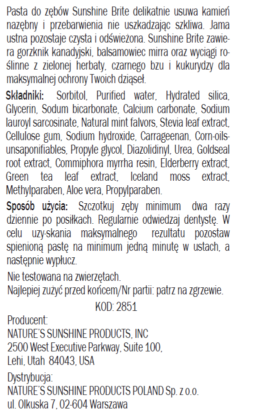 - Naturalna moc czystości: Sunshine Brite to pasta do zębów stworzona z myślą o naturalnym podejściu do pielęgnacji jamy ustnej. Głównym celem tej pasty jest zapewnienie Twoim zębom dokładnego oczyszczenia bez użycia sztucznych składników czy drażniących substancji.