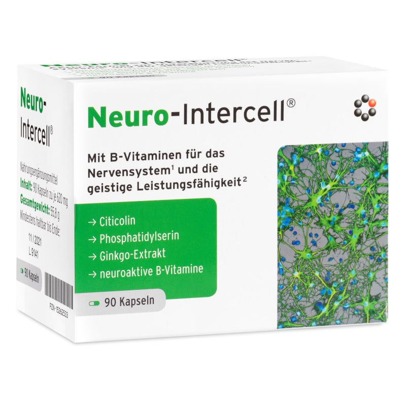 Neuro Intercell to zaawansowany suplement diety wspierający prawidłowe funkcjonowanie układu nerwowego oraz zdolności poznawcze. Ponadto dzięki innowacyjnej formule opartej na cytykolinie Cognizin®, fosfatydyloserynie, ekstrakcie z miłorzębu japońskiego oraz kompleksie witamin z grupy B, Neuro Intercell dostarcza kluczowych składników, które wspomagają pamięć, koncentrację a także regenerację neuronów.