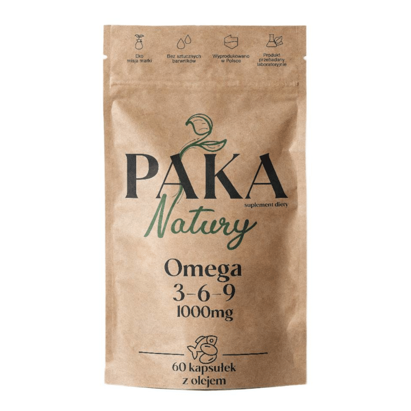 Suplement diety Omega 3-6-9 Paka Natury to kompleksowa formuła kwasów tłuszczowych niezbędnych dla prawidłowego funkcjonowania organizmu. Zawiera starannie dobrane proporcje kwasów omega-3, omega-6 i omega-9, pochodzących z wysokiej jakości oleju rybiego, oleju z nasion lnu oraz oleju słonecznikowego. Wzbogacony o naturalną witaminę E, ten suplement wspiera zdrowie serca, mózgu, układu odpornościowego i stan skóry – wszystko w formie wygodnych, miękkich kapsułek.