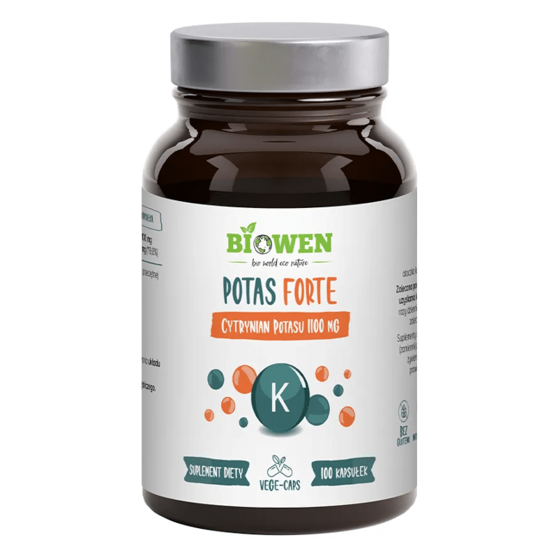 Suplement diety Potas Forte Biowen to skuteczna i wygodna forma uzupełniania potasu w diecie – w postaci dobrze przyswajalnego cytrynianu potasu. W każdej kapsułce znajduje się aż 1100 mg cytrynianu potasu, co odpowiada 400 mg jonów potasu, dzięki czemu preparat skutecznie wspiera prawidłowe funkcjonowanie mięśni, układu nerwowego i gospodarki elektrolitowej. To doskonała opcja dla osób, które chcą zadbać o równowagę mineralną organizmu, szczególnie w okresach zwiększonego wysiłku fizycznego, stresu lub przy diecie ubogiej w potas.